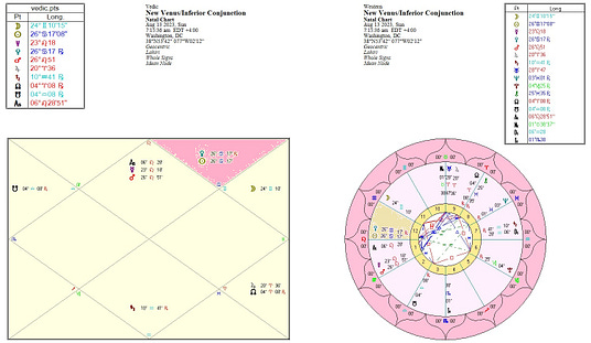 A New Venus cycle opens when the Sun and Venus meet in inferior conjunction. It is a moment when the Venusian faculties of emotion and evaluation are impressed with what Dane Rudhyar calls a "new quality of will and purpose." But the new quality of Venusian response and meaning does not become realized all at once. It is rather gradually translated from potentiality to actuality throughout the 584-day Venus cycle. (Michael R. Meyer,Venus Morning Star - Venus Evening Star; AstroDienst)
